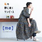 [me] 私の野に咲くワンピース レディース ロング フレア Aライン クルーネック バンドカラー 七分袖 7分袖 花柄 綿 コットン