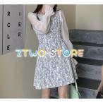 2色有り ワンピース レディース 長袖 スクエアネック ボリューム袖 レース フリル シースルー 花柄 Aライン フローラル くすみカラー スタイルアップ効果