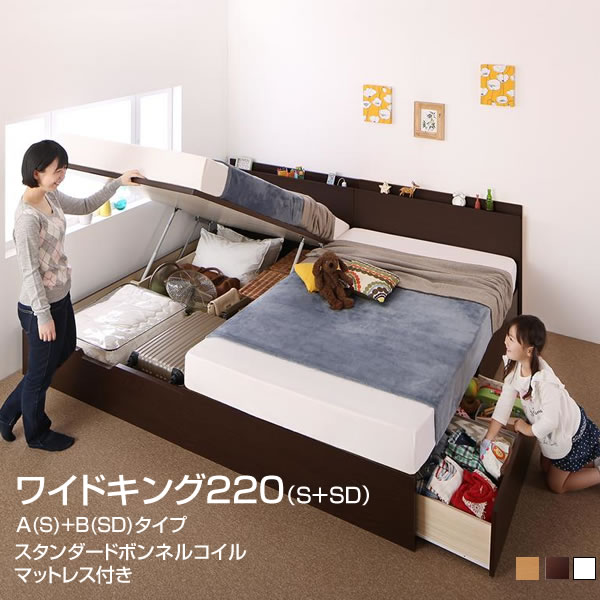お客様組立 日本製 ベッド 2台 連結 収納ベッド A(シンブル)+B(セミダブル)タイプ ワイドK220 跳ね上げ式ベッド 収納付きベッド 宮付き コンセント付き ガス圧 引出し付き ファミリーベッド 広い 大きい 夫婦 家族 新婚 大容量 スタンダードボンネルコイルマットレス付き