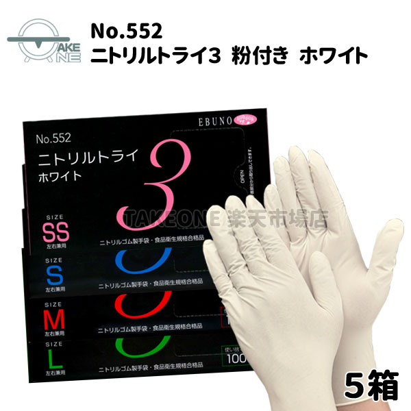 【5箱セット】ニトリル手袋 ss s m l ニトリルゴム手袋 ホワイト 粉付き 使い捨てゴム手袋 1箱100枚入 エブノ 食品衛生法適合 no.552 食品加工 感染予防 衛生用品 調理 介護 業務用 作業用 家庭用 キッチングローブ