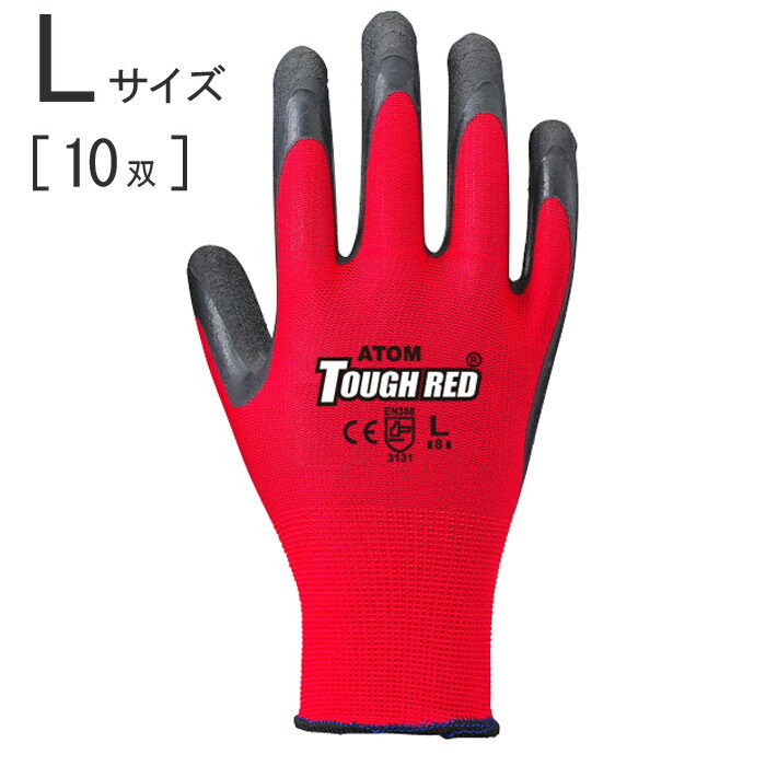 【8%OFFクーポン利用可〜12/4 14時まで】 作業手袋 スベリ止め グリップ 天然ゴム製背抜き手袋 No.1470 タフレッド 10双1セット単位 Lサイズ レッド 赤 ブラック 黒 Atom 通気性 フィット 耐久性