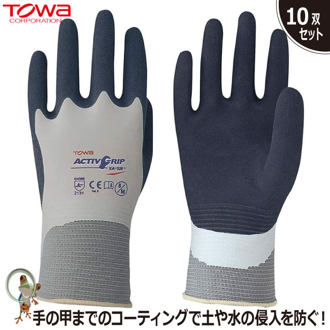 TOWA アクティブグリップ XA-326 【10双入・お得な20双入・30双入】 手の甲までのコーティングで土や水が入りにくい、天然ゴムコーティング手袋です。 天然ゴム手袋 作業手袋 トーワ rev