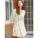 Allegra K フリルワンピース フレア キュート Vネック 花柄 パフスリーブ レディース