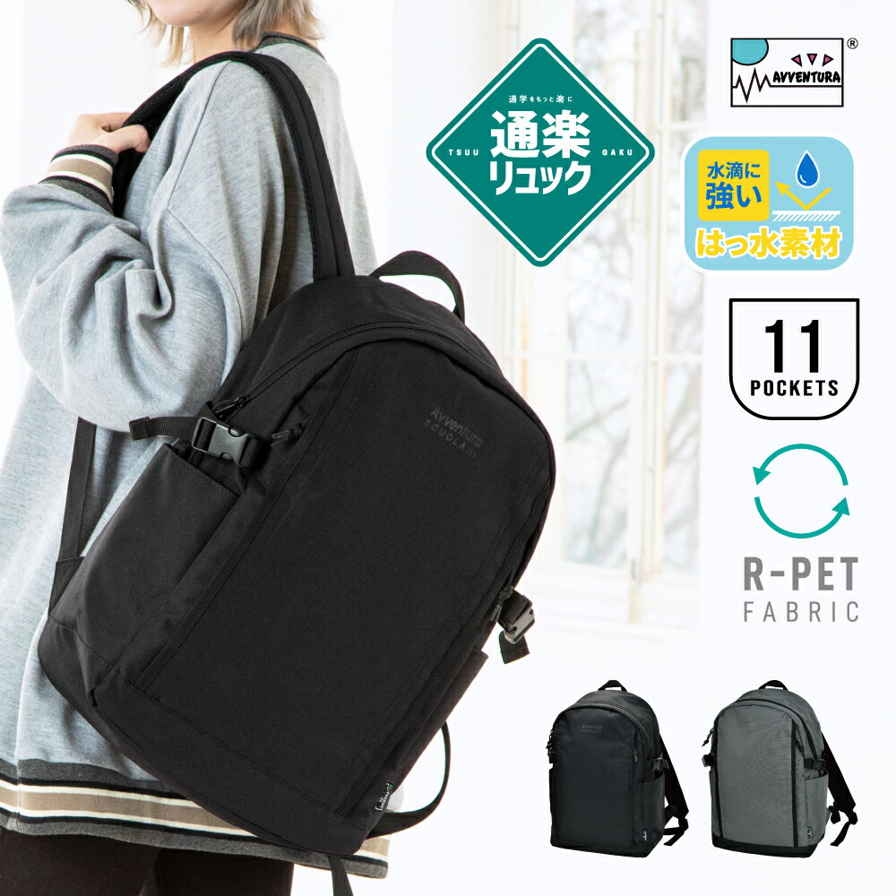 【クーポン利用で20%OFF】送料無料 アヴェンチュラ リュック リュックサック 撥水 大容量 a4 ロゴ ポケットたくさん サスティナブル エコ 黒 女子 男子 男女兼用 高校生 女子高生 中学生 レディース メンズ 大人 大学生 背面ファスナー かわいい おしゃれ 人気 ブランド