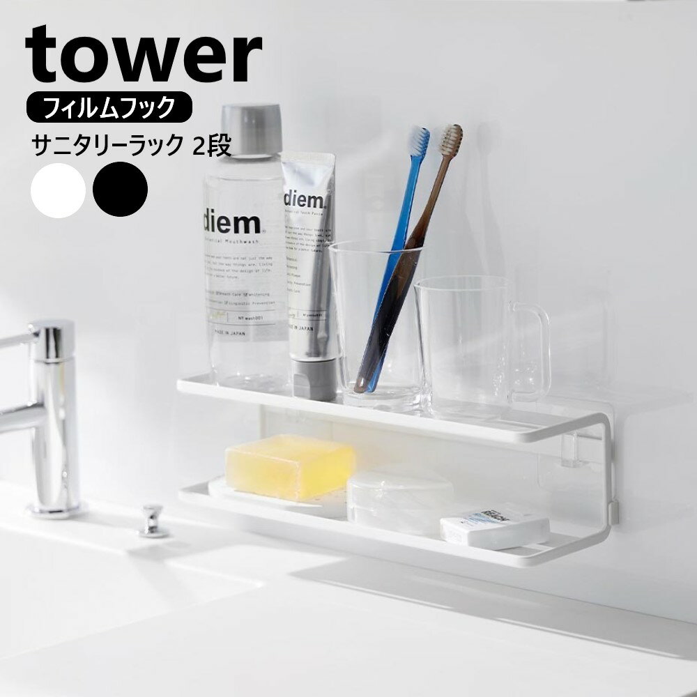 フィルムフックサニタリーラック タワー 2段 山崎実業 tower ホワイト ブラック 2173 2174 浮かせる収納 貼ってはがせる 洗面所 洗面台 歯ブラシ 電動歯ブラシ 電気シェーバー コップ コンタクト用品 洗面所収納 棚