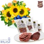 【父の日セットギフト】花キューピット お祝い 感謝 誕生日 ひまわりのリボンアレンジメントと【鎌倉ハム富岡商会】サラミとビーフジャーキーのおつまみセット