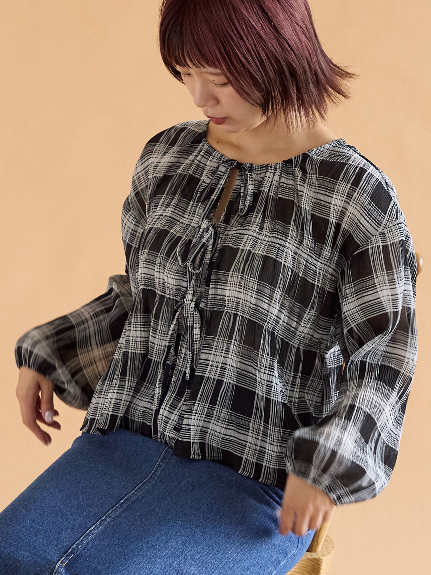 ブラウス シャツ シアーチェックボリュームスリーブブラウス レディース