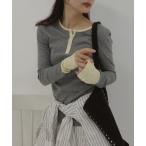 tシャツ ヘンリーネックレース付プレートロゴ長袖リブトップス レディース