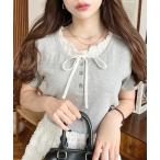 tシャツ レース付きヘンリーネックリブトップス レディース
