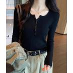 tシャツ 「人気新色登場入荷済!今すぐチェック!」韓国風リブカットソー 長袖トップス/ヘンリーネック&ボタンデザイン レディース