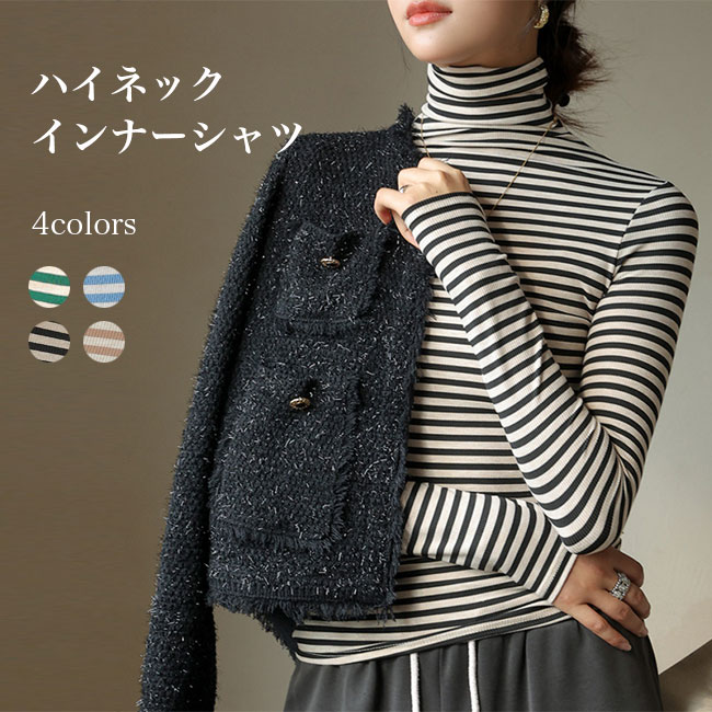 インナーシャツ ハイネック ボーダー レディース インナーウェア 長袖Tシャツ リブ 伸縮 トップス タートルネック 柄 秋 冬 春 ボーダーTシャツ インナー ストレッチ 肌着 リブTシャツ 縞柄 ブラック ブラウン ブルー グリーン