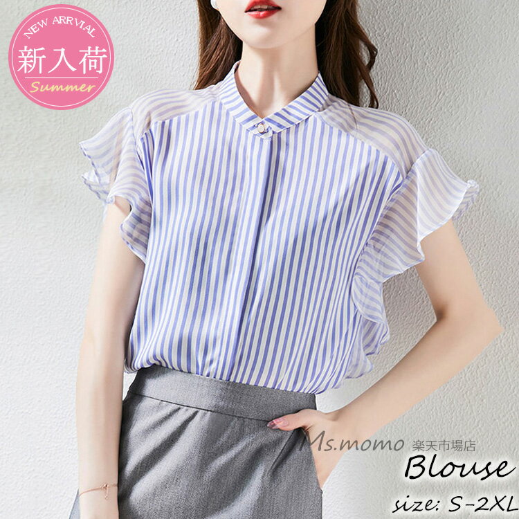ブラウス レディース 半袖ブラウス 春夏 オフィスブラウス ボーダー柄 フレア オシャレブラウス シフォントップス 韓国風 大人 通勤OL ゆったりシャツ UVカット 40代 30代 50代