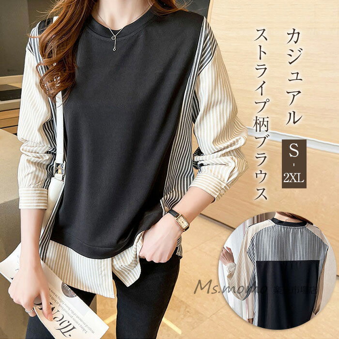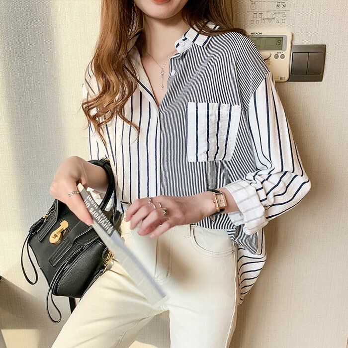 ブラウス レディース 長袖ブラウス 秋冬 オフィスブラウス ボーダー柄切り替え オシャレブラウス カジュアルトップス 韓国風 大人 通勤OL ゆったりシャツ 40代 30代 50代