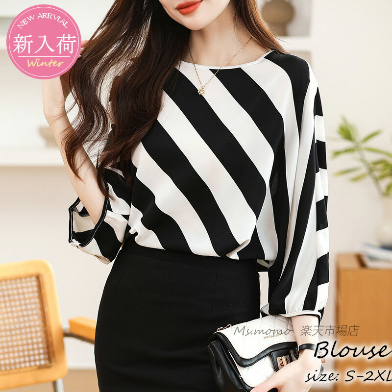 ブラウス レディース 長袖ブラウス 春秋 オフィスブラウス ボーダー柄 オシャレブラウス シフォントップス 韓国風 大人 通勤OL ゆったりシャツインナー 40代 30代 50代
