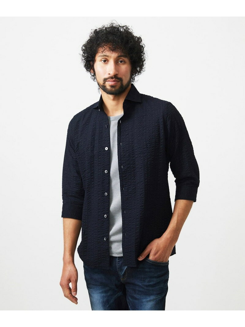 【SALE/20%OFF】MICHEL KLEIN HOMME リップルストライプ七分袖シャツ ミッシェルクランオム トップス シャツ・ブラウス ネイビー パープル ホワイト【RBA_E】【送料無料】