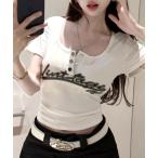 tシャツ ヘンリーネックロゴプリントTシャツ 半袖 レディース