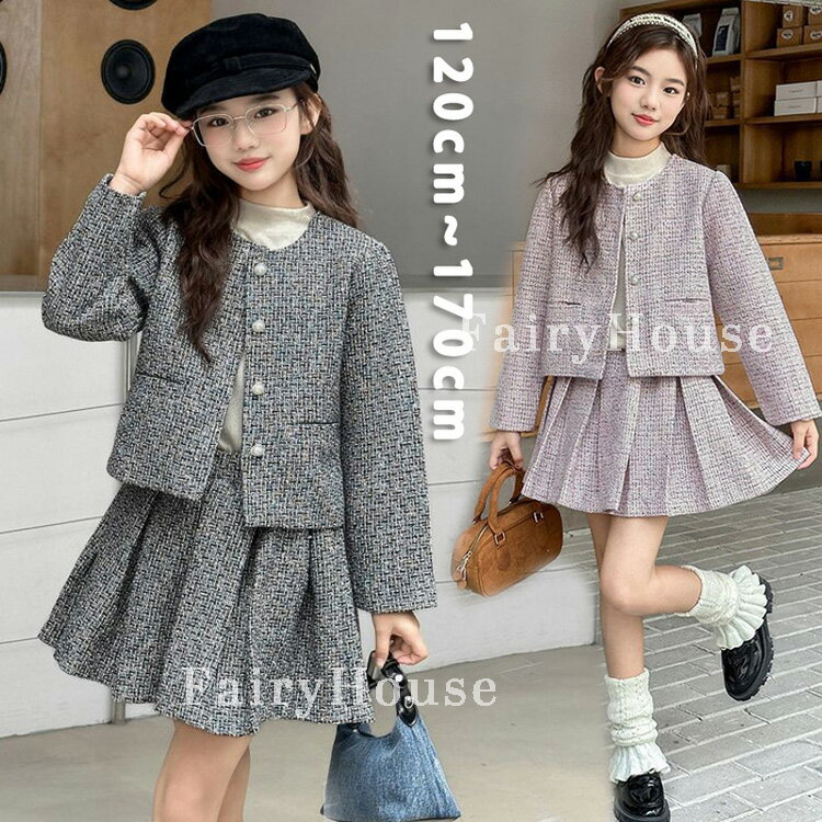 上品ツイード 女の子 スカートスーツ 発表会 2点セット シャネル風 セットアップ フォーマル キッズ 子供服 ジュニア ガールズ ジャケット ミニスカート プリーツ グレー ピンク 無地 おしゃれ 120 130 140 150 160 170 卒業式 小学生 6年生 中学生 卒園式 入学式 結婚式