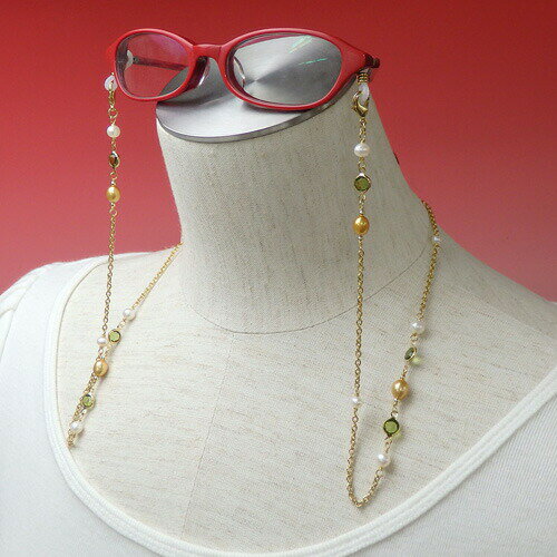 メール便 淡水真珠 メガネチェーン グリーン シャネルストーン ゴールドパール 淡水パール 眼鏡 チェーン グラスコード めがねチェーン 緑 マスクチェーン 爆買