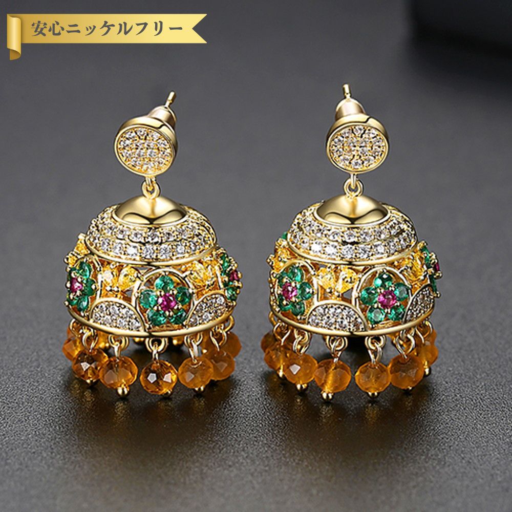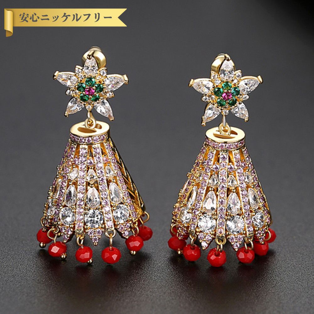 【50%OFFクーポン対象商品!!サンフラワーセールクーポン!先着500名様】 ピアス 両耳用 キュービックジルコニア 真鍮 レッド イエローゴールド スタッド 揺れる ゆれる ぶら下がり 上品 大きめ 大ぶり シャンデリア e19061711
