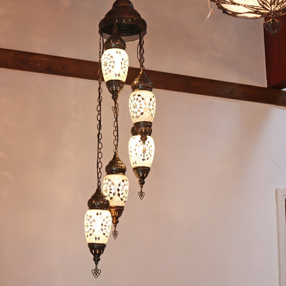 【10%OFFクーポン対象】トルコランプ モザイクガラスランプシャンデリア 5灯 螺旋 全高133cm 直径33cm ホワイト