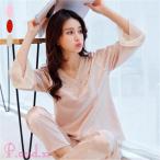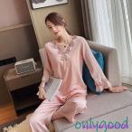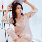 パジャマ レディース ルームウェア 長袖 部屋着 セットアップ 2点セット パジャマ ルームウェア 大人 寝巻き ゆったり 上下セット サテン風 長袖 春 夏 レース