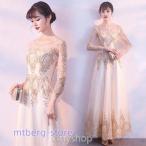 イブニングドレス 長袖 シャンパン色 ロングドレス Aライン 発表会ドレス 袖あり パーティードレス 二次会 お呼ばれドレス 優雅 エレガント 演奏会ドレス