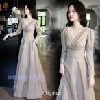 イブニングドレス ロングドレス シャンパン色 Vネック 長袖 発表会ドレス キレイめ パーティードレス 20代 30代 40代 二次会ドレス お呼ばれ 結婚式ドレス
