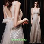 カラードレス スパンコール シャンパンシルバー リボン パーティードレス フォーマル ロングドレス スレンダードレス 結婚式 二次会 発表会 イブニングドレス