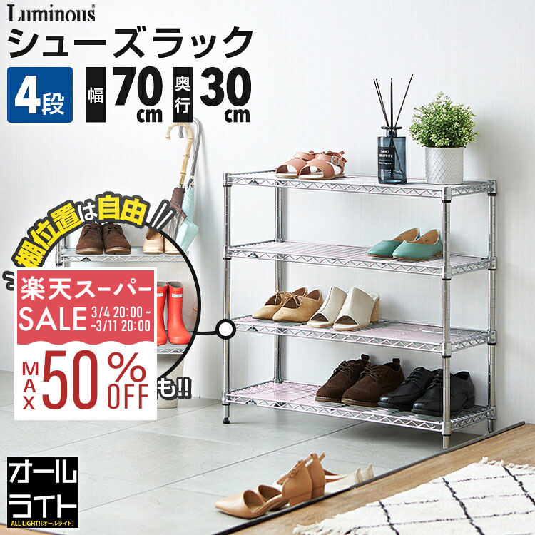 【10%OFF★3/4 20時〜】ルミナス ライト シューズラック 4段 幅70 奥行30 スリム 薄型 靴棚 下駄箱 靴箱 シューズボックス 靴入れ 靴 シューズ ブーツ スニーカー 玄関 組み立て 省スペース おしゃれ ラック 棚 スチールラック 収納 頑丈 可動棚 引っ掛け IHT3030-4