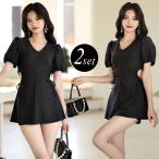 水着 レディース 大人っぽ ワンピース 2点セット Vネック パフスリーブ ギャザー 半袖 体型カバー パンツ セパレート 夏 黒