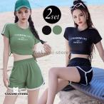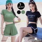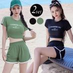 夏 フィットネス水着 レディース 体型カバー セパレート ブラ 一体型 トップス 半袖 ショートパンツ 2点セット バイカラー ライン ロゴ
