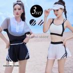 夏 フィットネス水着 レディース 体型カバー セパレート ブラ ショートパンツ 半袖 トップス 3点セット バイカラー ライン シボ風加工