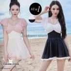 夏 水着 レディース ワンピース オールインワン 体型カバー おしゃれ かわいい フリル 白 黒 バイカラー 袖あり 光沢