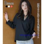 ブラウス 秋 冬 秋冬 春 シャツ 長袖 レディース パール パールボタン プルオーバー トップス スキッパーネック キーネック フェミニン オフィス 20代30代40代