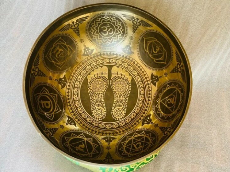 大きな仏足と神聖なシンボルが刻まれたシンギングボウル(様々なサイズ)-禅ボウル