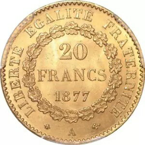 AA736 レア フランス 20 フラン ジェニー 1877 A パリ ゴールド ゴールド PCGS MS66 -> オファー-