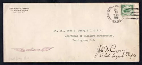 アメリカ 1918年 初飛行 カバー #C2 16セント ジェニー、ジョン・F・カリー中佐のサイン入り