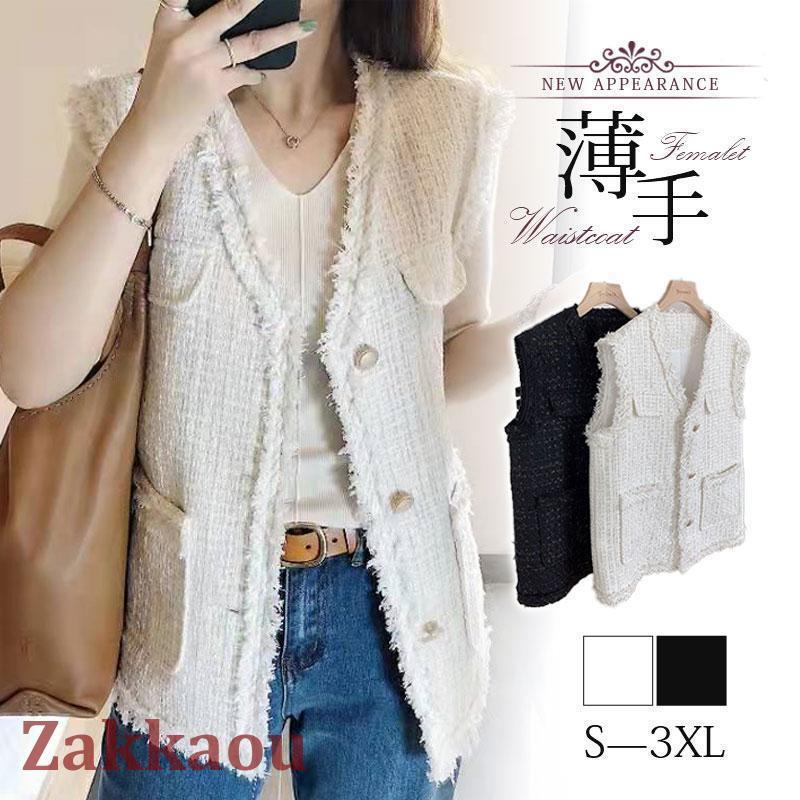 【期間限定10%OFF】ベスト ジレ レディース テーラード ツイード 前開き チョッキ Vネック アウター ジャケット ホワイト おしゃれ 体型カバー カジュアル