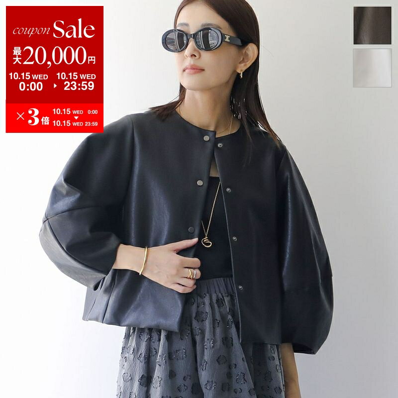 【10/15限定・最大2万円OFFクーポン配布中】anana アナナ ジャケット a79-012 レディース エコレザー ブルゾン ノーカラー ランタンスリーブ 七分袖 ショート丈 カラー3色