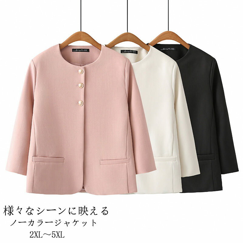 大きいサイズ レディース ジャケット アウター ノーカラージャケット ノーカラー 羽織り 八分袖 無地 ポケット クルーネック 丸首 卒園 卒業式 入園 入学式 参観日 セレモニー 通勤 春新作 春服 秋服 ブラック 黒 白 ブラック 裏地 裏地付き 40代 50代 おしゃれ きれいめ