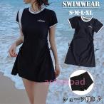 レディース水着 ワンピース パッド付き 黒 半袖 2点セット ショートパンツ付き 小胸 体型カバー スポーツ ラッシュガード フィットネス ノンワイヤー ゆったり