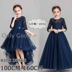 ピアノ発表会 ドレス 中学生 ワンピース ジュニアドレス 七五三 子供ドレス ネイビー キッズドレス レース 透け感 五分袖 高級感 リボン付き フィッシュテール