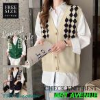 ニットベスト vネック レディース カーディガン チェック 柄 秋 冬 レイヤード ジャガード ジュニア 黒 白 ブラック グリーン スクール 韓国