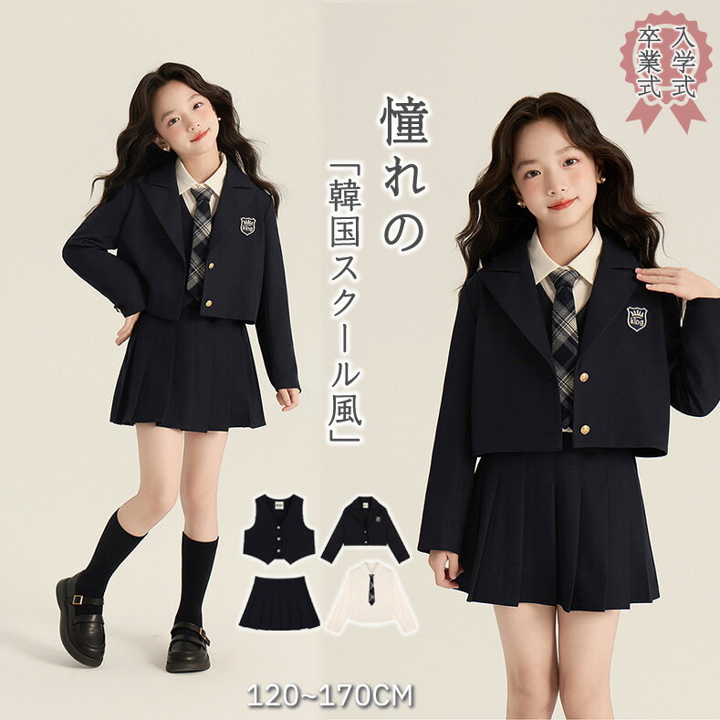 【15%OFFクーポン+P5 2/21まで】卒業式 スーツ 女の子 プリーツスカート 140 卒服 女子 小学生 フォーマル 4点セット ガールズ ベスト 韓国 なんちゃって制服 6年生 小学校 中学生 上下セット ブラウス ネクタイ ジュニア セットアップ 発表会 入学式 高級感 文化祭 七五三