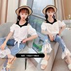子供服 セットアップ キッズ 女の子 春夏 トップス 半袖 ブラウス シャツ 肩出し デニムパンツ 長ズボン 韓国子ども服 ジュニア ベビー服 おしゃれ 可愛い 新品