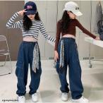 キッズダンス衣装 セットアップ へそだし 子供服 ヒップホップ ダンス衣装 女の子 ボーダー柄 tシャツ デニムパンツ 上下セット ダンスウェア パンツセット
