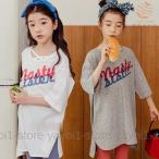 スリット入り Tシャツ 半袖 女の子 カットソー ゆったり 上着 クルーネック ロングTシャツ 英字柄 韓国子供服 キッズ 女児 ジュニア 通園 通学 お出掛け 2色