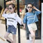 110-160cm 女の子 Tシャツ 半袖 丸首 肩出し ダメージ加工 英字柄 ゆったり トップス カットソー 2色 韓国子供服 キッズ ジュニア シンプル 通園 通学 お出掛け