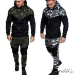 スウェット上下セット メンズ ジャージ 部屋着 運動服 スポーツウェア カジュアル 切替 迷彩柄 フード付き 春秋