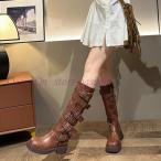 厚底 編み上げブーツ ロング バイクブーツ レディース ロングブーツ レースアップ ベルトブーツ 太ヒール バックファスナー コスプレ靴 ジョッキーブーツ